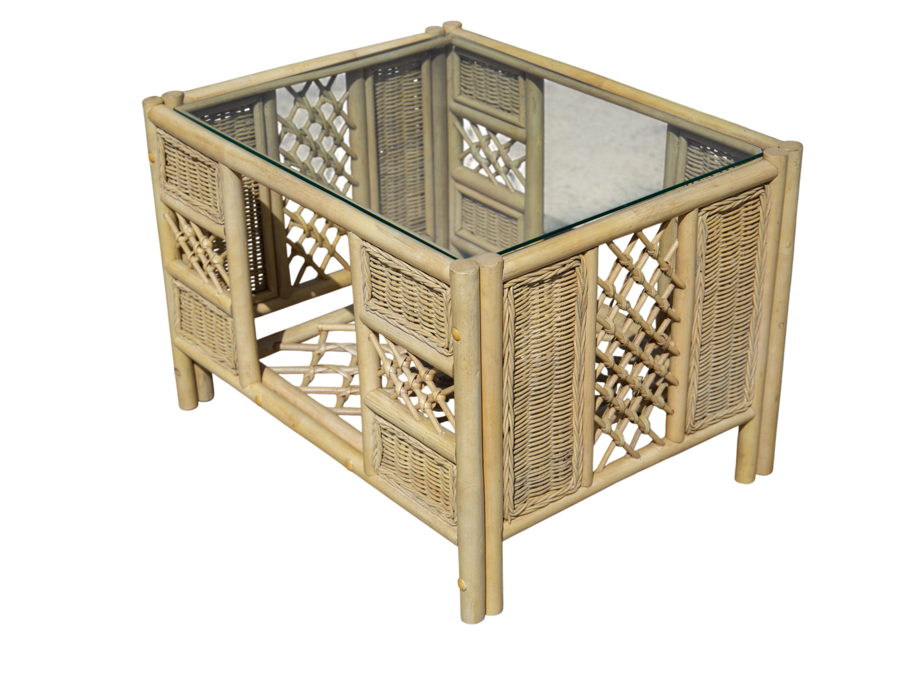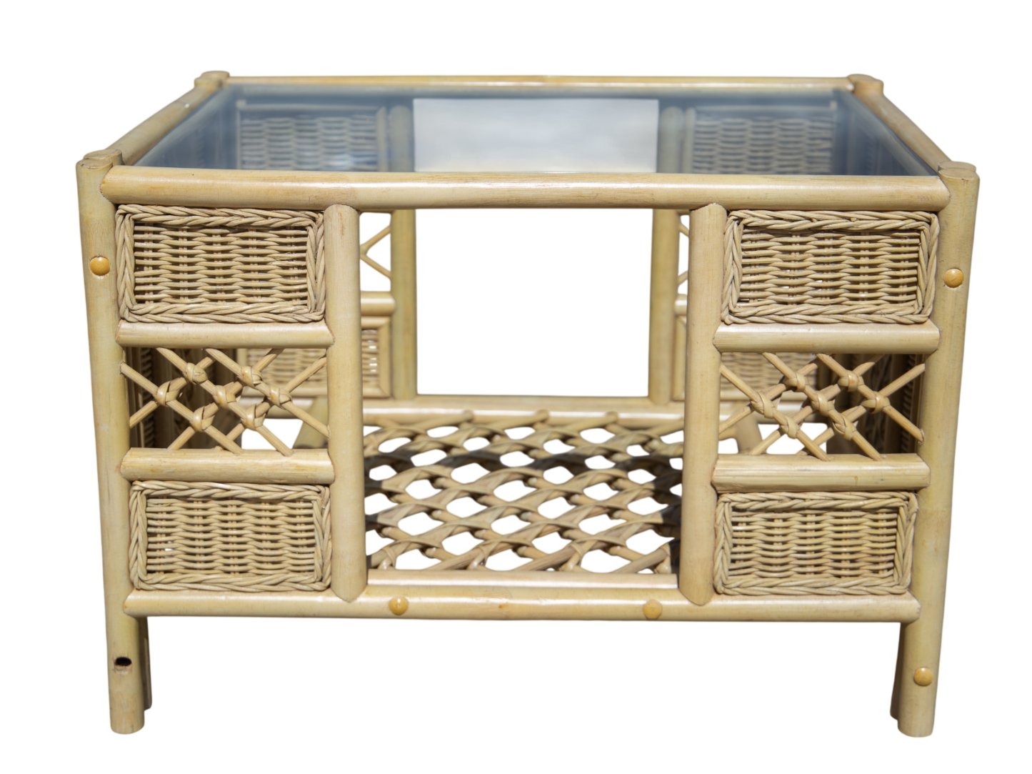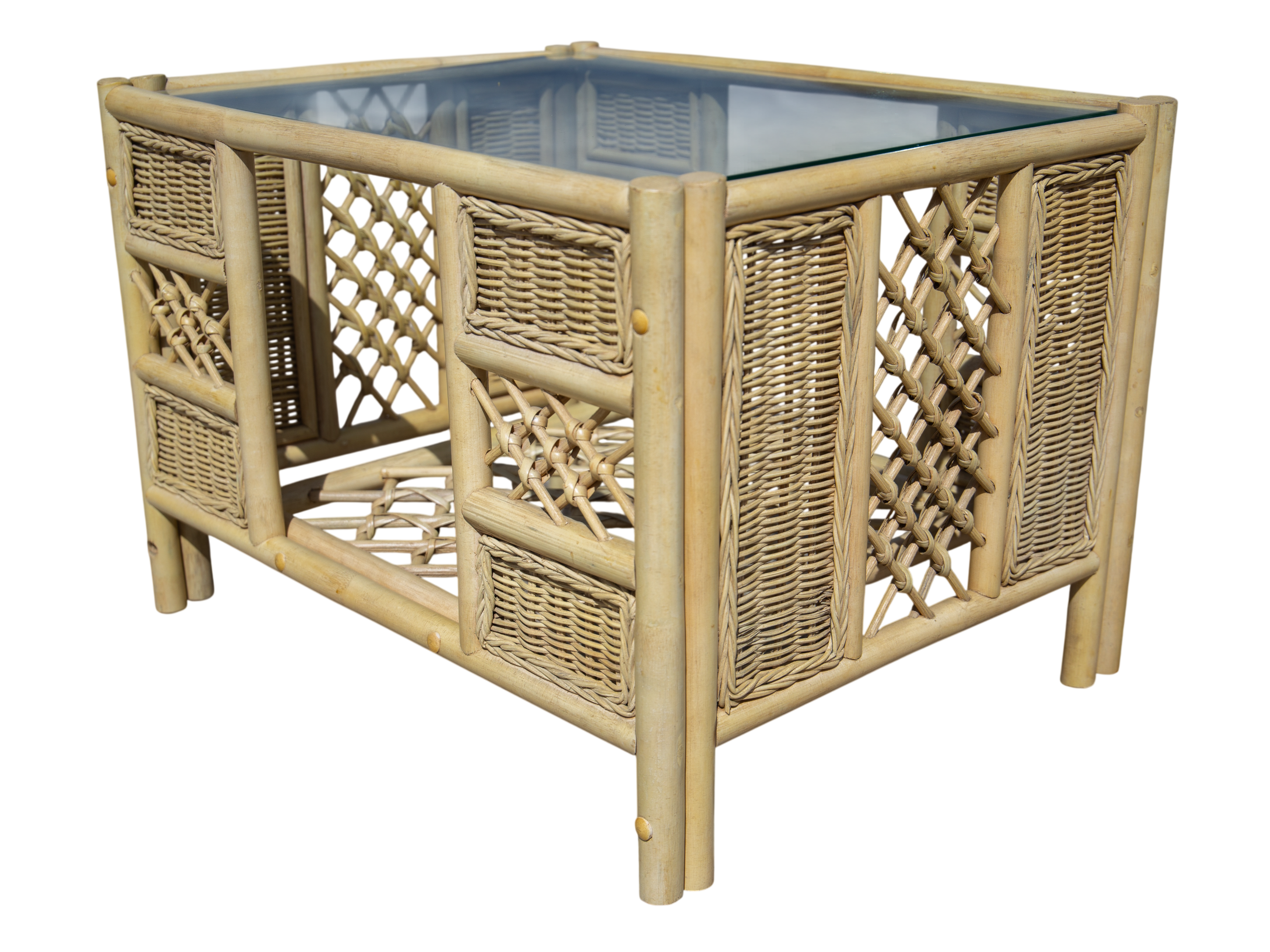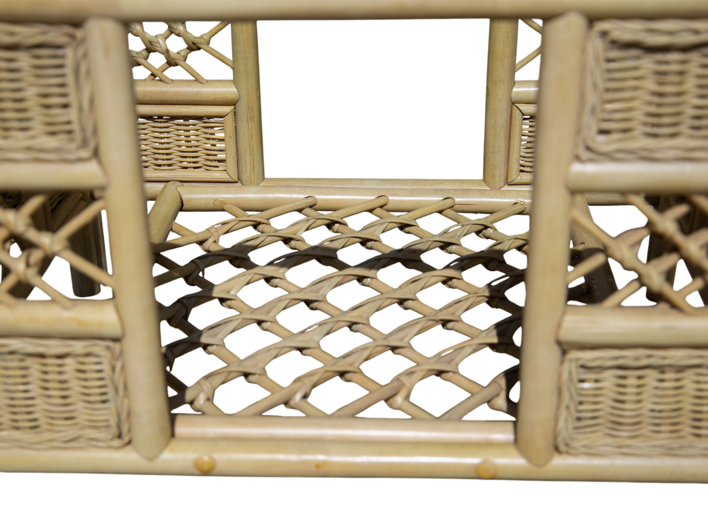 Combines a tight-knit rattan weave with thick cane borders and a light cross-weave.