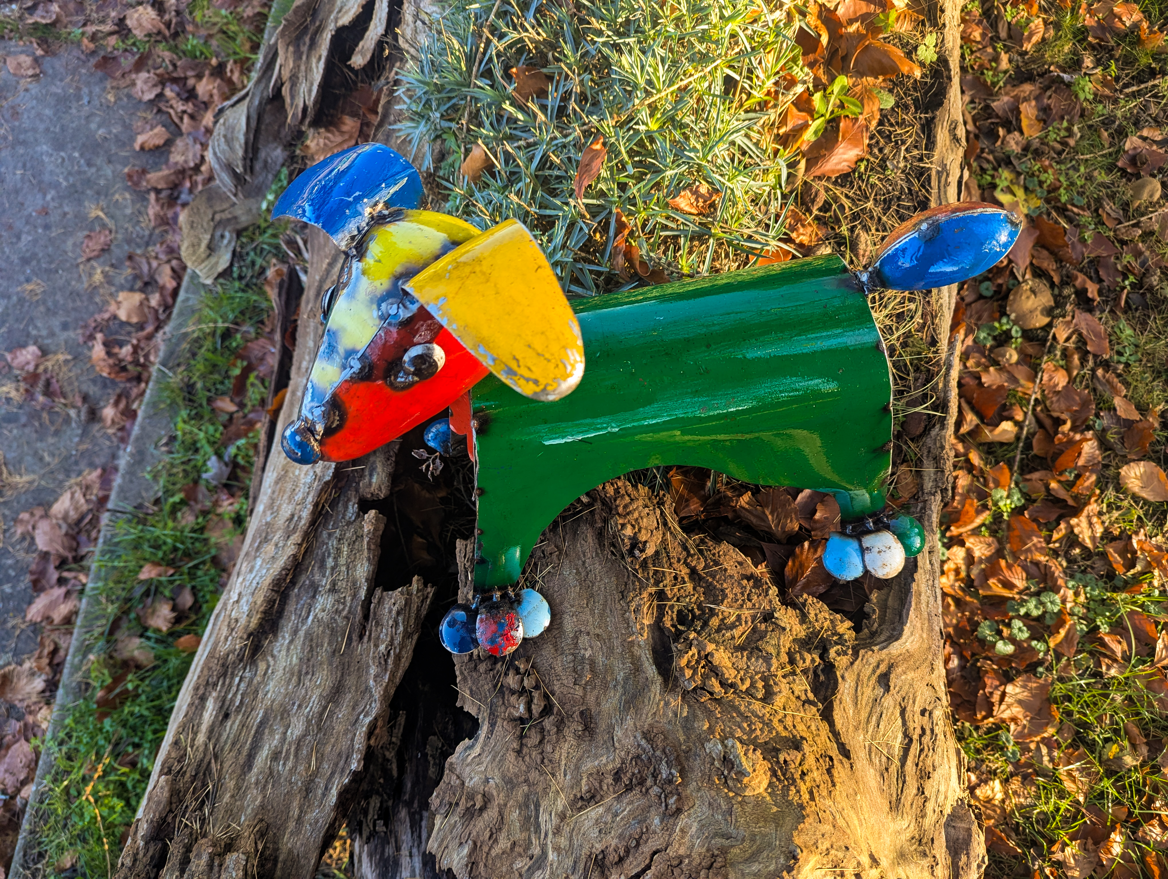 Celebrate eco-friendly artistry with this striking standing dog sculpture, handcrafted from repurposed oil drums. Each piece is unique, highlighting the rich textures, patina, and character of recycled metal. Handcrafted in Vietname from recycled oil drums this makes it a captivating addition to any space.