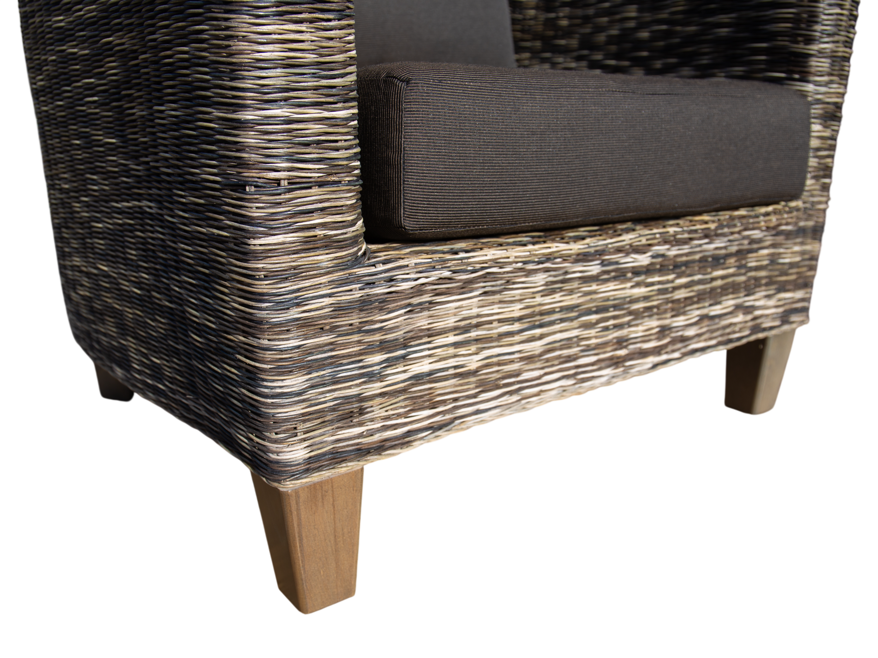 The Keswick - Hand-woven tri-colour rattan weave, dark hardwood frame,8mm tempered thick glass, fitted cushions which are piped and zipped with scatter-backs with 'no-sag' quality.