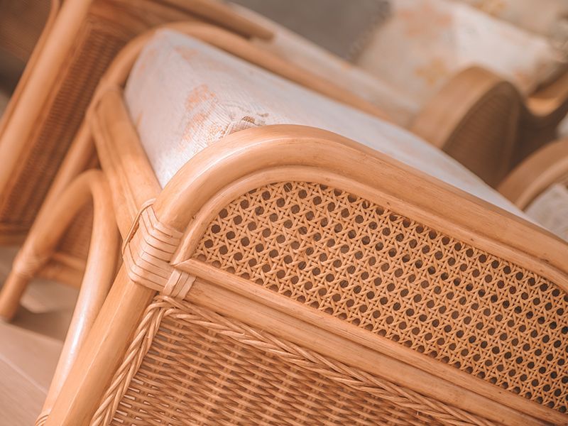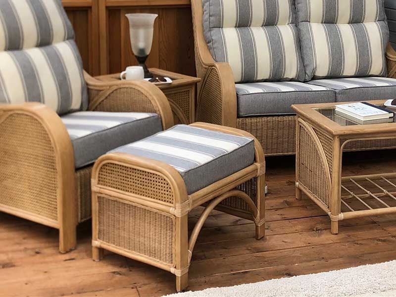 The classic design of this footstool has lovely braided rattan panelling at intervals through the frame.