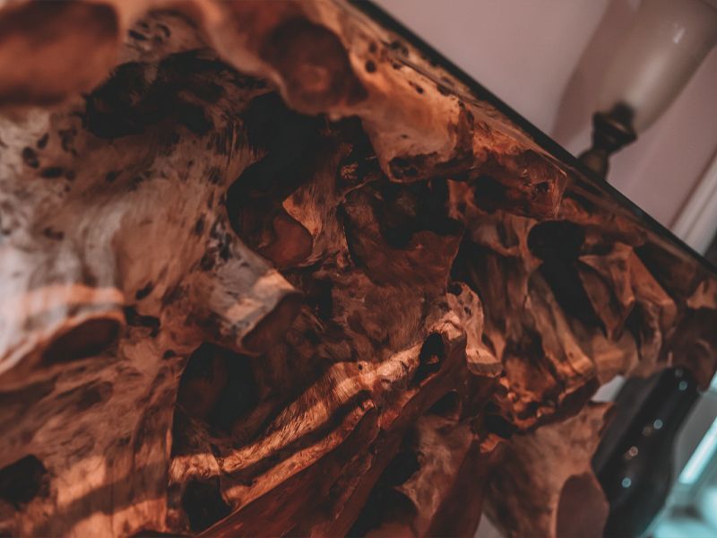 The intricate root structure is expertly shaped and finished to a smooth, refined surface, then sealed with a light resin coating for enhanced durability. Resting above this sculptural base is a 10mm thick, toughened and bevelled glass top, offering a clean, modern contrast to the rustic wood beneath. Designed for everyday use, this table is equally at home indoors or outdoors.