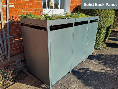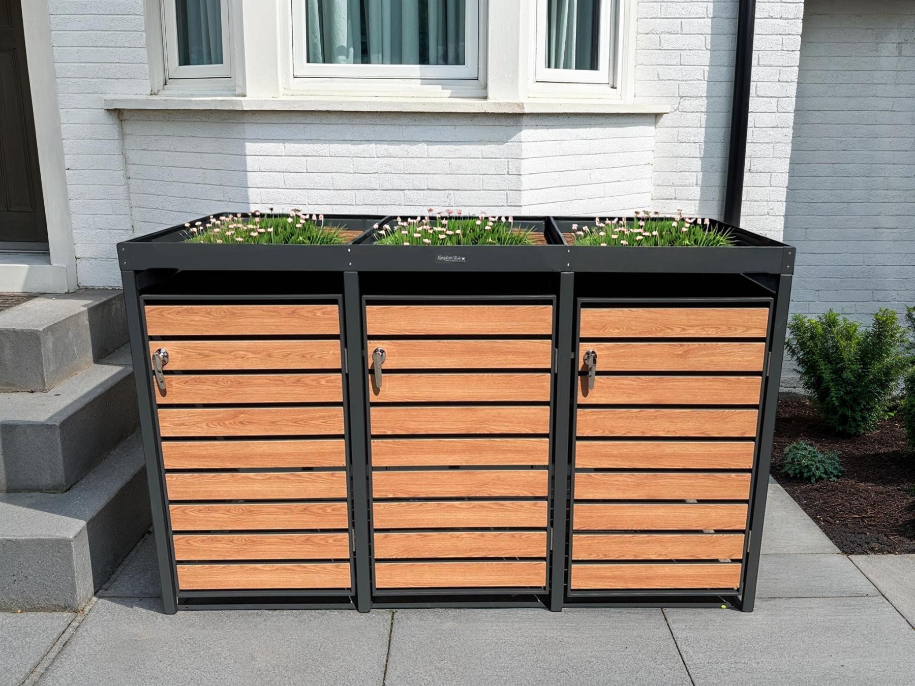 This specific wheelie bin cover is fitted with built-in planters on its top surface.